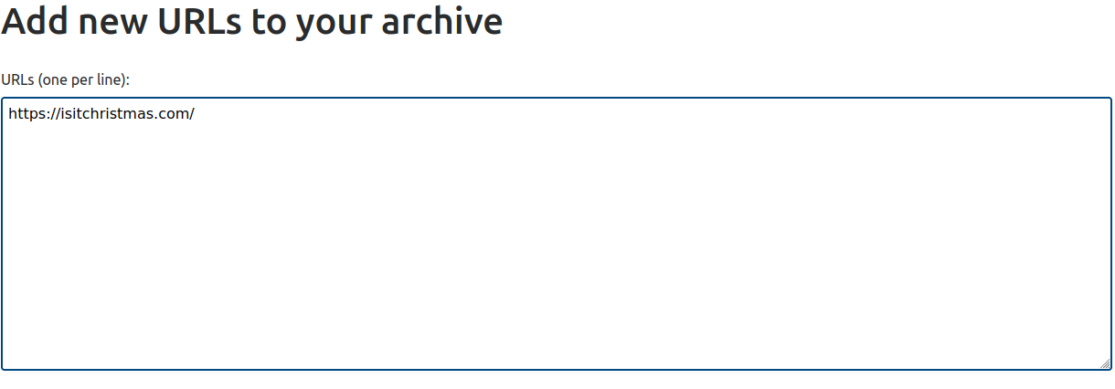 Now the screen will show a textbox where URLs can be entered. Enter the desired URL you wish to archive. For this tutorial we will use https://isitchristmas.com/ since it is a tiny site.