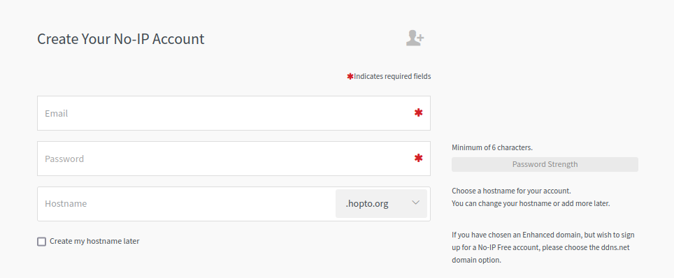Enter your email address and preferred password for this account. You will also want to setup a hostname. For this tutorial we will use testdomain12345.ddns.net.
