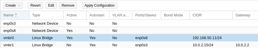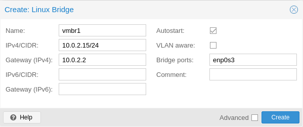 Now we need to create a new bridge to enp0s3 with the gateway from before. This sets up the internet connectivity.