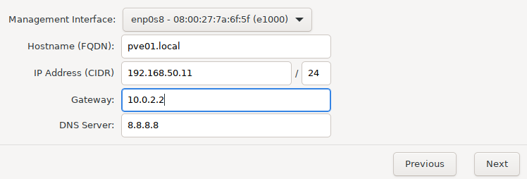 This is where the network setup is done. For our purposes, we need to use the second interface. Set the IP address like below. The gateway is required here but will be changed later. For DNS I use the google DNS server. After this is setup click “Next”.