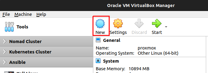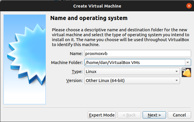 Then name the machine however you like. I will be using “proxmoxvb”. I set it to Linux, Other Linux (64-bit) since Proxmox isn’t in the drop down.