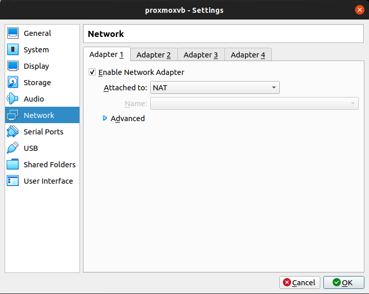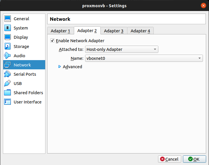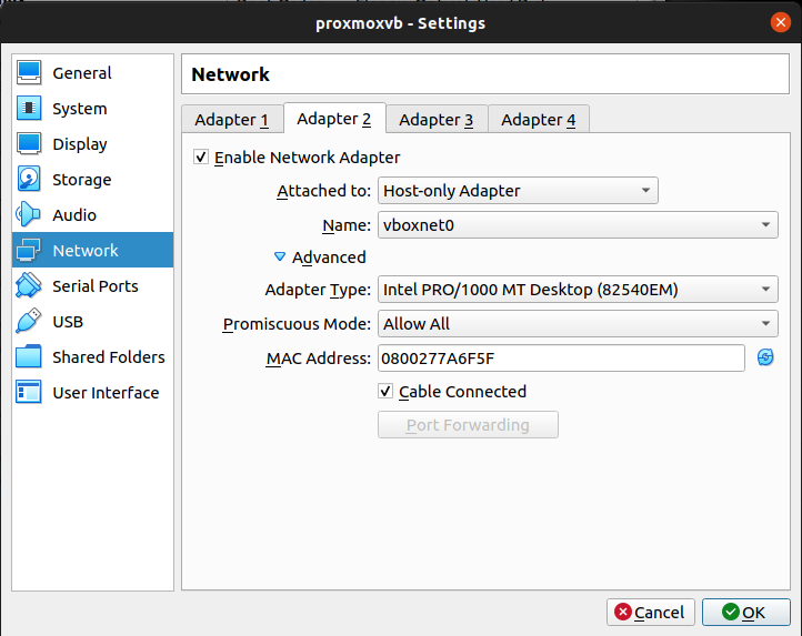Ensure Promiscuous Mode is set to “Allow All” for the Host-only adapter. This is for VM connectivity from Proxmox child VMs to our own computer.